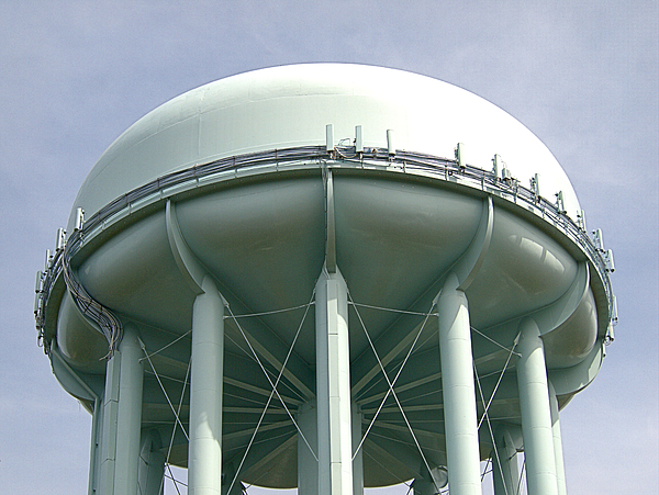 Water towers facilitate water filtration and purifaction for localities. In recent years, they have also generated significant revenue for municplailites who lease out the space for cell antenna. This antenna array shows a tenants mounted antennas, which signal transmission and reception to mobile devices within a specific area. The number of antennas (typically between 3-18) is based on several factors, including the number of tenants (wireless carriers); the type (voice or data) and volume of transmission; the technology being used (eg: CDMA, GSM, LTE, WiMAX) and the frequency of spectrum (in MgH) utilized.